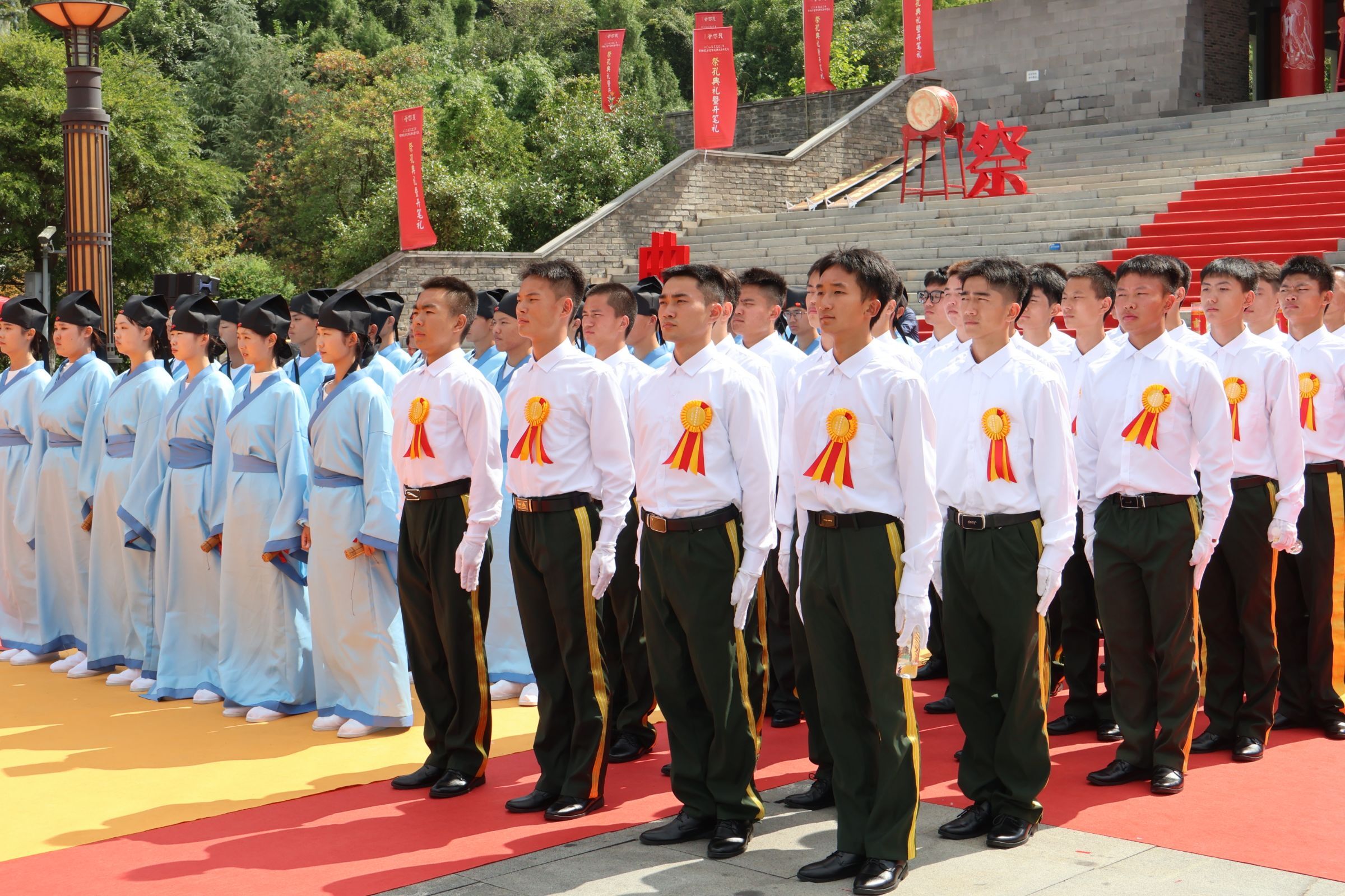 上午9时28分,庄重的祭孔大典正式拉开帷幕。在现场,我校国旗护卫队队员身着整齐制服,步伐铿锵、仪态庄重,圆满完成了“敬献花篮”的重要任务。他们以一丝不苟的态度和反复演练的严谨,将每一个动作、每一个细节都做到尽善尽美,不仅展现出贵财学子昂扬的精神风貌,更将对先贤孔子的崇高敬意与对中华优秀传统文化的珍视融入其中。